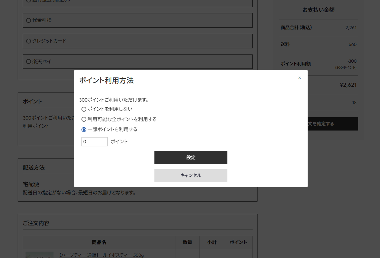 ご注文の際、カート内の下記画面でポイントの利用についてご選択いただき次に進んでください。