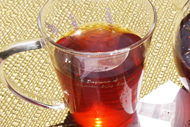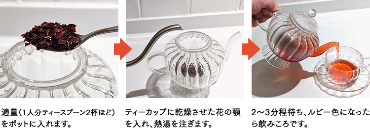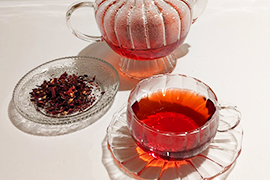 お茶の色が鮮やかなルビー色で、酸味があるのが特徴です。ビタミンC・クエン酸・リンゴ酸・カリウム等が豊富に含まれていますので、食欲がない時や疲れ気味の時などにもおすすめのハーブティーです。